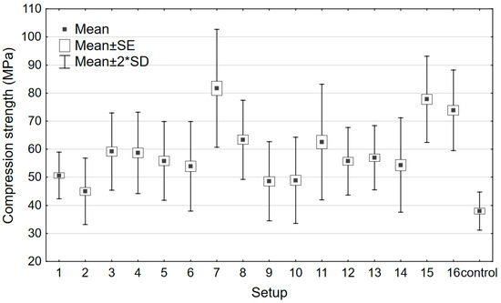 Regardless of the densification parameters, the average compression strength of all the treated samples greatly exceeds that of the control samples, which is 38 MPa. Among the treated samples, only the average strength of 45 MPa in setup #2 did not differ significantly from the control samples at a 5% significance level. No significant difference was found between the lower average values of setups #1, #2, #9, and #10, as determined by the Tukey honestly significant difference (HSD) test. In all these cases, the compression ratio and pressing temperature were set at a low level. In contrast, when these factor levels were set at the high level, as in the case of setups #7, #15, and #16, the highest strength values were obtained. With a low steaming time, high pressing rate, high pressing temperature, and low pressing time, setup #7 achieved an average compression strength of 82.3 MPa, which is 116.6% greater than that of the 38 MPa control samples.