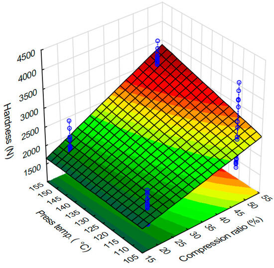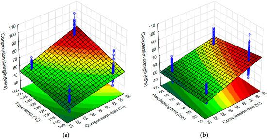 These interactions exhibit a spreading interaction type, meaning that the effect of the compression ratio is directly proportional to the levels of the pressing temperature and the pressing time. As shown by the response surfaces (Figure 16a,b), when both factors are at high levels, the positive effect is amplified.