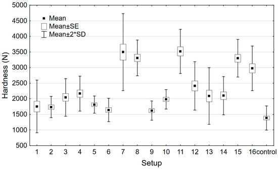 Figure 20 shows that the average hardness values of all densified samples exceeded the control value of 1384 N measured on the tangential surface following the ASTM D 143 standard (Section 13) [15]. However, for setups #1, #2, #5, #6, and #9, the Tukey HSD test did not reveal significant differences compared with the control value.