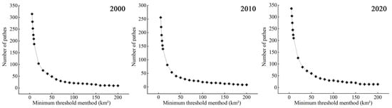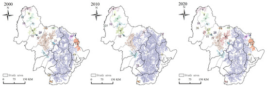 - The ecological source areas in the southeastern part of the Xiaoxing’an Mountains centered around Yichun City, are concentrated, while the ecological source areas in the northern part, around Heihe City, are dispersed. The total area of ecological sources peaked in 2010 at 47,054.10 km2, and decreased to its smallest size in 2020, at 38,398.49 km2, a reduction of 18.40% compared to 2010.