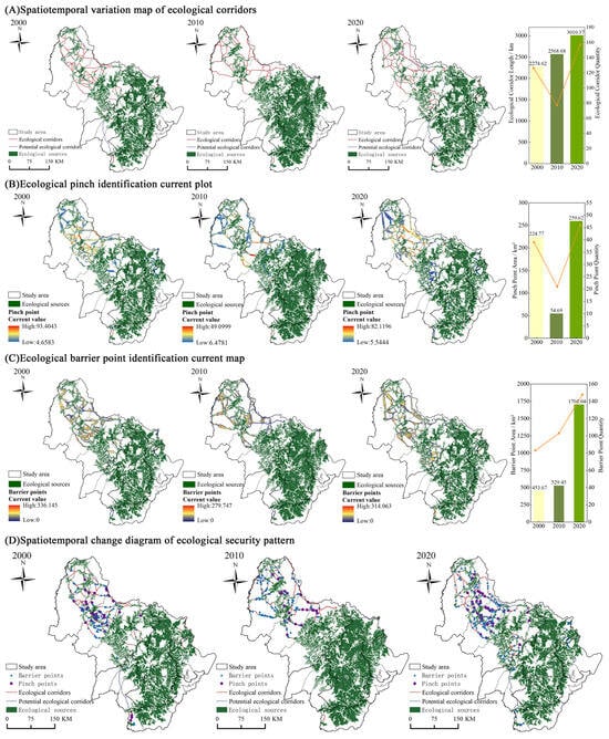 - The spatial distribution of ecological corridors and pinch points exhibits notable spatial variation. In the northern region, ecological corridors are densely arranged in a spider-web-like radial pattern, with a high number of ecological pinch points. In contrast, the southeastern region has fewer and shorter ecological corridors, with fewer pinch points.