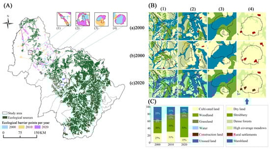 - Ecological barriers are primarily concentrated in the ecologically unstable regions of the northern part of the study area. Over the last 20 years, the area occupied by ecological barriers has expanded by 280%. Forests, farmland, and unused land are the main land types of ecological barriers in all three phases, accounting for more than 85% of the barrier area. Four key barrier zones identified are located at the forest-farming interface in the northwestern part of the Xiaoxing’an Mountains, mostly consisting of large wetland areas, rural settlements, and drylands.
