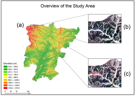 Overview of the study area. (a) DEM of Pingquan County, with different colors representing various elevations as shown in the legend. (b) Study area before the fire. (c) Study area after the fire. Panels (b,c) were captured using Landsat 9 imagery. The RGB432 band combination represents near-infrared (Band 4), red (Band 3), and green (Band 2), highlighting vegetation and surface features. In panel (c), the red-highlighted regions indicate the burned areas.