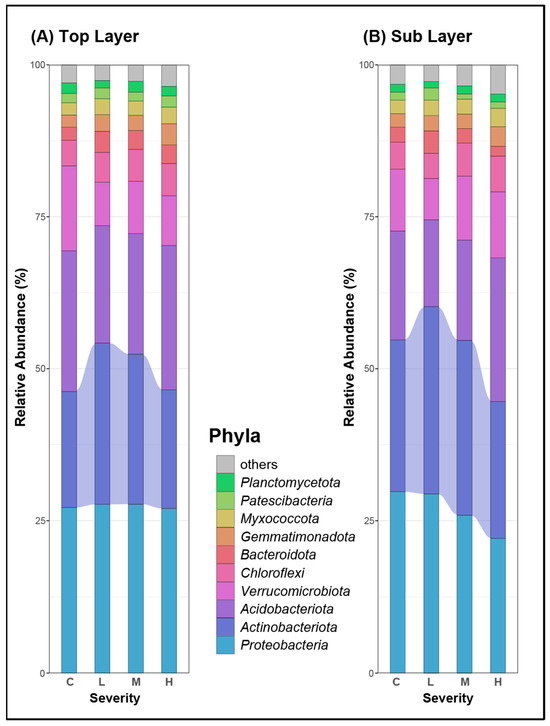 Relative abundances of dominant phyla. (A) Top-layer soil. (B) Sublayer soil. Phyla are selected as dominant phyla if their relative abundance is >1% in at least one sample type at each site. “C” stands for the control test, “L” represents light severity, “M” stands for moderate severity, and “H” stands for high severity of fire impact.