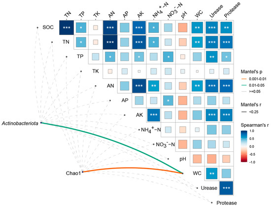 Spearman correlation and Mantel test analysis between soil environmental factors and Actinobacteriota/Chao1. Soil environmental factors include soil organic carbon (SOC), total nitrogen (TN), total potassium (TK), alkaline nitrogen (AN), available phosphorus (AP), available potassium (AK), ammonium nitrogen (NH4+−N), nitrate nitrogen (NO3−−N), pH, water content (WC), urease, and protease. The upper triangular matrix in Figure 2 displays the Spearman correlation coefficients between the environmental factors, with colors representing the strength and direction of the correlations (blue for negative, red for positive). The size of the squares is proportional to the magnitude of the correlation coefficients. In the squares, asterisks represent statistical significance: *** indicates p < 0.001, ** indicates p = 0.001–0.01, * indicates p = 0.01–0.05, and no asterisk indicates non-significance. Overlaying the correlation matrix, lines represent significant relationships identified by the Mantel test, with line colors indicating the p-value categories (0.001–0.01, 0.01–0.05, ≥0.05). Line thickness represents the Mantel’s r value, and line type (solid or dashed) corresponds to the p-value significance levels.