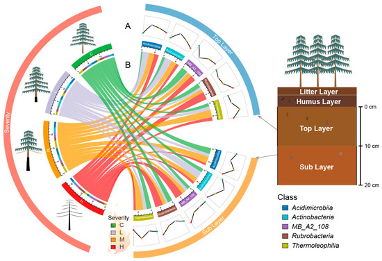 The chord diagram (Figure 4) illustrates the relative abundance and interactions of Actinobacteriota classes under different fire severities (C: Control, L: Light, M: Moderate, H: High) across two soil layers (top layer: 0–10 cm; sub layer: 10–20 cm). In our study, five Actinobacteriota classes were identified: Acidimicrobiia, Actinobacteria, MB_A2_108, Rubrobacteria, and Thermoleophilia.