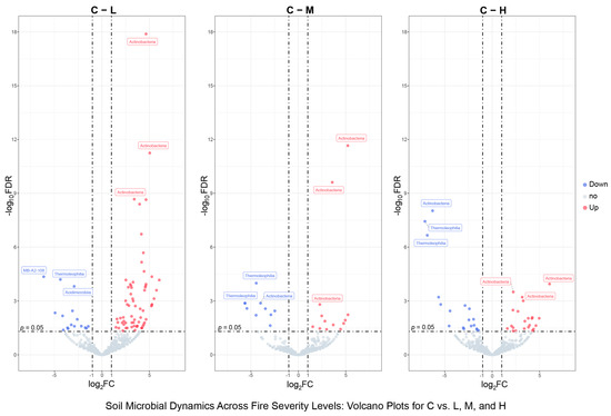 The volcano plot analysis (Figure 5) provides a detailed view of the relative abundance changes in Actinobacteriota classes—Acidimicrobiia, Actinobacteria, MB_A2_108, Thermoleophilia, and Rubrobacteria—under different fire severities (C vs. L, C vs. M, C vs. H). In the comparison between control and light-severity fire (C vs. L), Actinobacteria showed a significant increase in abundance, with a much higher increase compared to other classes, reflecting its adaptability to mild fire-induced changes. In contrast, Thermoleophilia exhibited a marked reduction, highlighting its sensitivity to light-severity fire. No significant changes were observed for Acidimicrobiia, MB_A2_108, and Rubrobacteria under this condition. When comparing control with moderate-severity fire (C vs. M), Actinobacteria maintained a significant increase, although the magnitude of the increase was lower than in the light-severity fire comparison, as indicated by FDR analysis. Thermoleophilia continued to decrease. In comparison with high-severity fire (C vs. H), Actinobacteria still exhibited the highest increases, but the magnitude of the increase was significantly lower than in both the light- and moderate-severity fires. Additionally, the highest decrease in abundance was also observed in Actinobacteria, indicating a more complex response of Actinobacteria to high fire severity. Thermoleophilia showed the most significant reduction, with a decline greater than in both the light- and moderate-fire severities. These results show the differential sensitivities of Actinobacteria and Thermoleophilia to varying fire severities. Other classes, including Acidimicrobiia, MB_A2_108, and Rubrobacteria, showed a degree of stability across different fire severities.