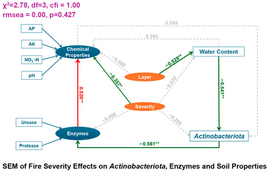 Structural Equation Model of fire severities on soil properties, Actinobacteriota, and enzymes. The model shows the hypothesized relationships between fire severity, soil properties, Actinobacteriota, and nutrient decomposition enzymes. Gray lines indicate no significant direct effects, red lines represent significant positive effects, and green lines represent significant negative effects. Statistical significance levels indicated by * for p < 0.05, ** for p < 0.01.