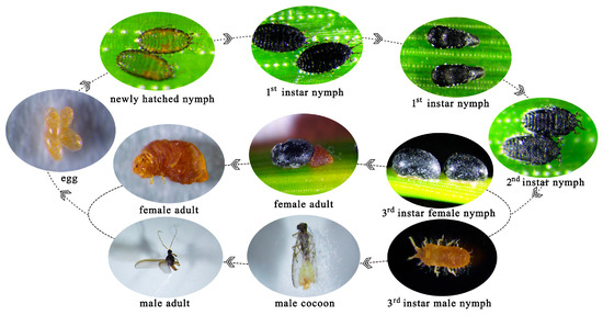 The eggs of M. sinensis are oval in shape, initially yellow in color, and later dark yellow, enclosed in a white, flocculent egg sac. Newly hatched nymphs had a nearly transparent body with fully developed appendages. The first-instar nymphs were light gray to black, with six moniliform antennae, one pair of eyes, 11 distinct body segments, and three pairs of legs (Figure 2a). During the later stages, nymphs fix themselves to the needles, and the antennae, legs, and one eye gradually disappear. The thorax and abdomen were enlarged, and the body surface adhered to a wax layer, forming a mesocell. At this point, the nymphs molted into the second instar (Figure 2a). In the second instar, the antennae, legs, and other appendages were reduced, earning the nymph the name “no-limb nymph”. The mouthparts are well developed, and the body is covered by a black hard shell resembling a black sesame seed attached to the needles. Later, male and female nymphs showed clear differentiation. The female, without limbs, has a larger, obovate body with a black shiny shell, whereas the male is smaller, oval-shaped, and also has a black shell (Figure 2a). The third-instar female nymphs grew within the shell and did not emerge (Figure 3). The third-instar male nymph is yellow, with one pair of antennae and three pairs of legs and is well developed and active in crawling (Figure 3). The adult female remains within the shell, with indistinct body segments, a pair of black monocular eyes, and degenerated antennae and legs. Male adults have filamentous antennae, a pair of compound eyes, and prominent features on both sides. The ventral tail end of the male had a hook-shaped mating device and multiple white tail filaments (Figure 2). The developmental stages of M. sinensis are shown in Figure 3.