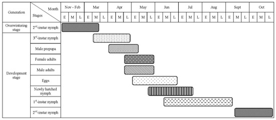 Seasonal life cycle of M. sinensis in Diebu district of Gansu Province during 2021–2022 seasons. E, M, and L denote the early, middle, and late period (ten days) of a month, respectively.