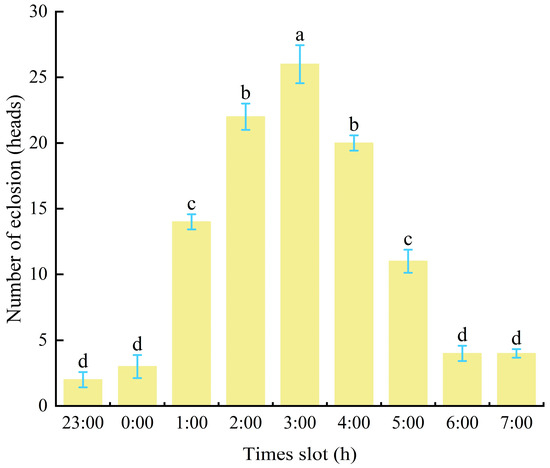 In southern Gansu forests, a large number of male cocoons appeared between April 17th and 19th, with the peak emergence of male adults occurring between April 28th and 29th. By the end of May, all adult males had emerged (Figure 5). Observations in P. tabulaeformis forests revealed that male cocoons emerged between 11:00 PM and 7:00 AM, with peak emergence occurring between 2:00 AM and 4:00 AM (Figure 5). Laboratory observations confirmed that the number of emerging male cocoons was significantly higher at 3:00 AM than at other periods (p < 0.05), with a maximum of 26 adults emerging within one hour.
