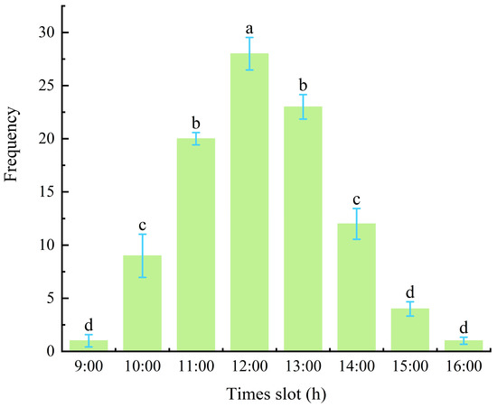 The peak mating period was at 12:00 PM, during which the highest mating frequency of 28 events per hour was recorded (Figure 6), which was significantly higher (p < 0.05) than that observed during other periods. Mating activity of M. sinensis adults was observed between 9:00 AM and 4:00 PM, and no mating behavior was recorded during the other time periods (Figure 7a). In contrast, mating frequencies at 9:00 AM and 4:00 PM were the lowest, with only two mating events per hour, which were significantly lower at other time intervals between 9:00 AM and 4:00 PM (p < 0.05).