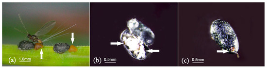 Female adults of M. sinensis show tails, mates, sacs, and scale shell orifices: (a) Adult females exert their tails and mates; (b) female adults lay eggs in the scale shell and form sacs; (c) aperture of the scale shell.