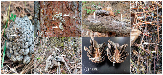 Pupation sites of adult M. sinensis males: (a) Cone Apex Depression; (b) under the bark of a tree; (c) among the curling dead leaves; (d) on the bark of a dead tree; (e) cone base and in phosphorous tablets; (f) on the damp needles on the shaded side.