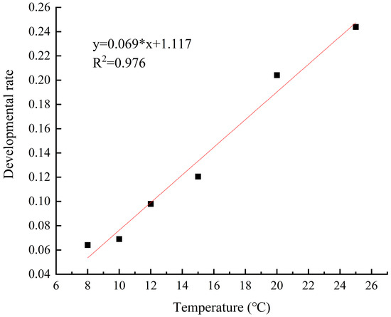 The effective accumulated and threshold temperatures for the development of M. sinensis eggs were determined to be 86.1 °C (K = 86.1 °C) and 3.5 °C (C = 3.5 °C), respectively (Table 1). Therefore, the relationship between the developmental rate of the M. sinensis egg stage and temperature can be expressed by the following formula: