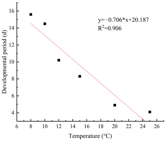 The development rate of M. sinensis eggs gradually increased and the development period gradually decreased as the temperature increased from 5 °C to 28 °C. Linear regression analysis revealed a significant linear relationship between the development rate and duration of scale eggs and temperature (R2 = 0.976; R2 = 0.906) (Figure 9 and Figure 10). At the lower temperature of 8 °C, the development rate of the eggs was 0.064, and it took 15.6 days to hatch. In contrast, at 25 °C, the development rate increased, and the development period was reduced to 4.1 days.