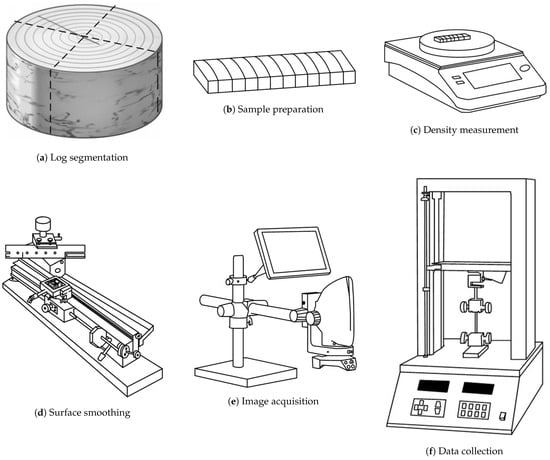 The modulus of elasticity (MOE) and modulus of rupture (MOR) of the samples were measured using a three-point bending test on a universal testing machine (model LSC 1/300-2, Tokyo testing machine, Japan, Figure 1f). This test was conducted last to avoid destructive effects on the samples. After each test, the corresponding mechanical performance data were recorded and analyzed. A total of 223 sets of data, including images (Figure 2), density, MOR, and MOE values, were collected for the dataset.