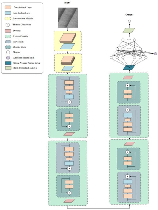 For the accurate prediction of wood’s mechanical properties, this study proposes a model based on a multi-input deep residual network. The model combines traditional image processing with deep learning to improve prediction accuracy and reliability. As shown in Figure 3, the core of the model is a deep residual network, which is a structure known to effectively address information degradation in deep networks. The model contains multiple residual blocks, each comprising the following elements: