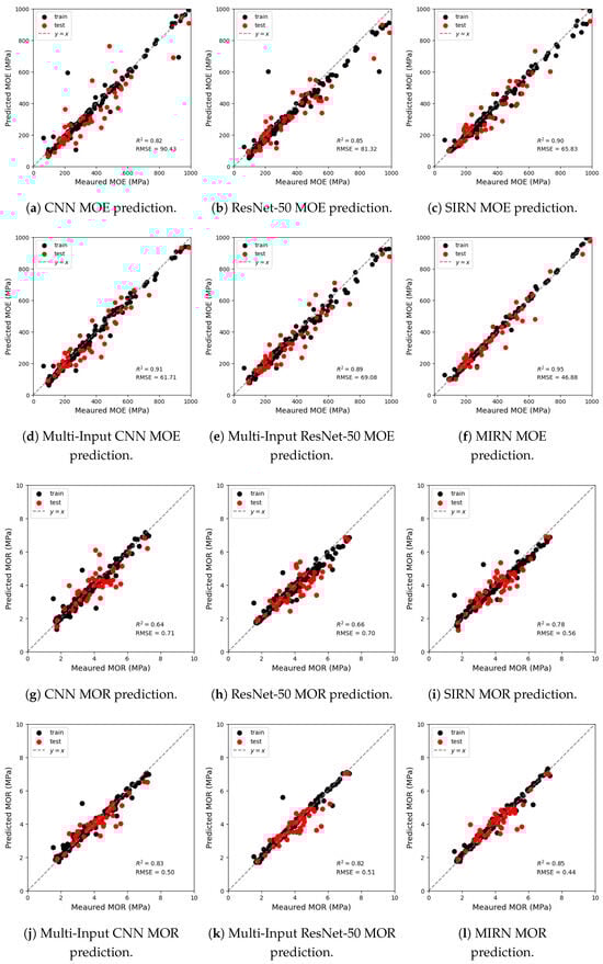 In terms of sensitivity to density data, as an important physical measure, density is especially crucial for improving multi-input models’ accuracy in predicting MOE, as it directly relates to the internal structure and quality of wood, which are key factors affecting elasticity. The addition of density information significantly enhances the model’s predictive ability for MOE, as reflected in the high accuracy of MIRN. In MOR prediction, although density information also contributes, its impact is lower than in MOE prediction due to the susceptibility of MOR to factors beyond microscopic structure. The multi-input residual network, with specific structural adjustments such as residual connections and deep feature integration, optimizes the model’s responsiveness to physical data like density. This structure enables the model to be more sensitive and effective when incorporating density information, particularly for the complex prediction task of MOE.