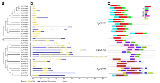 Phylogenetic, gene structure, and conserved motif analyses of the EgrNF-Y genes. (a) Phylogenetic analysis of the EgrNF-Y genes. (b) The yellow boxes represent CDS and black line represents intron, the upstream/downstream are depicted by blue boxes. (c) Conserved motif analysis. Conserved motifs (1–10) are represented by different colored boxes, and nonconserved sequences are indicated by gray line (sequences of conserved motifs are given in Figure S1).