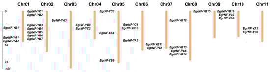 Chromosomal location of NF-Y genes in E. grandis. Chromosome numbers are shown at the top of each bar. Chromosome size is indicated by the vertical scale.