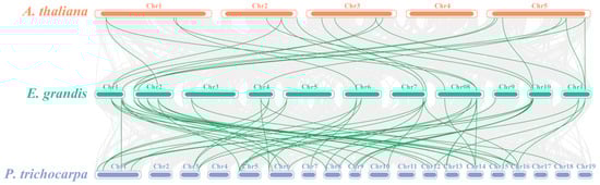 Synteny analyses of NF-Y genes between E. grandis and two module plants (Arabidopsis thaliana and Populus trichocarpa). The green lines indicate the homologous pair of the NF-Y gene and their corresponding location on each chromosome. The gray lines in the background represent the syntenic pairs of the whole genome. To distinguish between different types of plants, the chromosome bars and the names of each plant species are represented in a different color (Arabidopsis is orange, E. grandis is green, and P. trichocarpa is blue).