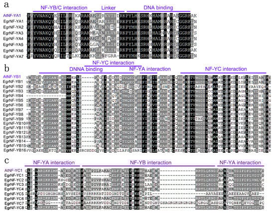 The protein sequences of the 31 members were analyzed using ClustalW 2.1 and Genedoc 2.7. software to further investigate the conserved regions of EgrNF-Y proteins. Multiple sequence alignment results suggested that each EgrNF-Y family member contained a heterodimerization domain and a DNA-binding domain. These core conserved regions of the EgrNF-YA proteins consisted of 53 amino acids (AAs) and included two highly conserved domains: the NF-YB/C subdomain and the DNA binding domain. These domains were separated by a conserved linker with 21 AAs (Figure 4a). As shown in Figure 4b, the central domain of EgrNF-YB proteins had 91AAs. Among EgrNF-YB proteins, EgrNF-YB2/4/16 had shorter conserved domains. Figure 4c shows that EgrNF-YC subunits also consisted of a core histone-like sequence with a central domain of about 79 AAs in length. Among these, EgrNF-YC5 and EgrNF-YC7 were slightly different from other NF-YC proteins. Overall, the EgrNF-YA protein was more evolutionarily conserved in the three subfamilies (Figure 4).