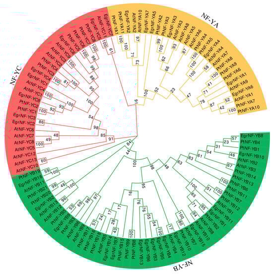In order to elucidate the evolutionary relationship and potential function of EgrNF-Y proteins, a phylogenetic tree was generated using NF-Y protein sequences from E. grandis, A. thaliana, and P. trichocarpa using the MEGA7 software. The phylogenetic study result showed that the 107 NF-Y members formed three distinct clusters: NF-YA (yellow), NF-YB (green), and NF-YC (pinkish red). It was as per the subfamily classifications of the EgrNF-Y proteins in this study (Table 1). Considering the evolutionary tree’s phylogenetic relationship and the known functions of AtNF-Ys, it was possible to make further predictions about the functions of EgrNF-Y members. Within each cluster, it was observed that certain pairs of paralogous NF-Y proteins consisted of one EgrNF-Y and one AtNF-Y, for example, EgrNF-YA1 and AtNF-YA6, as well as EgrNF-YC5 and AtNF-YC11. This also suggests that they have more similar biological functions. This study also found that EgrNF-YB9, AtNF-YB6/9, and PtNF-YB3/5 formed a distinct subgroup, classified under LEC1/LEC1-like. In addition, it also identified three pairs of analogs: EgrNF-YB4 and EgrNF-YB5, EgrNF-YB7 and EgrNF-YB14, and EgrNF-YC2 and EgrNF-YC3, whereas most EgrNF-Y proteins shared low homology with other members, suggesting that they evolved in diversity (Figure 5). In order to further analyze the NF-Y evolutionary relationship of woody plants, we used the NF-Y protein sequences of E. grandis, P. tabuliformis, and P. trichocarpa to construct an evolutionary tree. The results show that some NF-Y homologous protein pairs were composed of EgrNF-Y and PtNF-Y, such as EgrNF-YA1/A4 and PtNF-YA6/A4, EgrNF-YB1/B8/B10/B15/B16 and PtNF-YB2/B4/B13/B10/B19, and EgrNF-YC7 and PtNF-YC12. This result indicated that these gene pairs have similar biological functions, and angiosperms were more closely related to each other than gymnosperms (Figure S2).