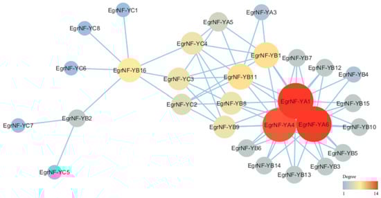 Predicted EgrNF-Y protein interaction networks. The blue line represents an interaction between the two proteins. The size of the node indicates the degree of interaction with other proteins (the color gradient from blue to orange signifies a range from weak to strong interaction).