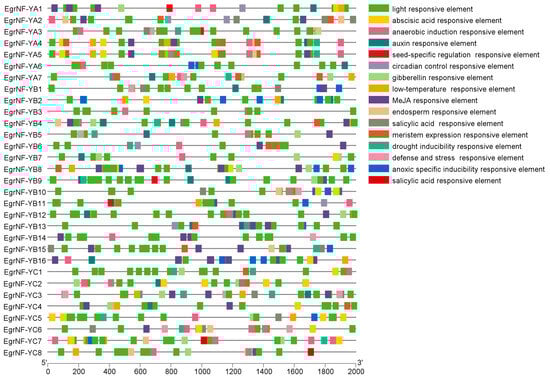 To investigate the potential role of the 31 EgrNF-Y genes, we utilized PlantCARE software to analyze the distribution of cis-elements within the 2000 bp EgrNF-Y promoter regions. Further, 19 types of cis-regulatory elements were detected across the 31 EgrNF-Y genes, including elements related to light responsiveness, hormone responsiveness, stress responsiveness, and growth regulation, in addition to the core cis-elements. A comprehensive classification and detailed information on all cis-elements are provided in Table S5. Meanwhile, the cis-elements binding site is also shown in Figure 7. These findings suggest that EgrNF-Y genes may play a significant role in stress responses and growth regulation.