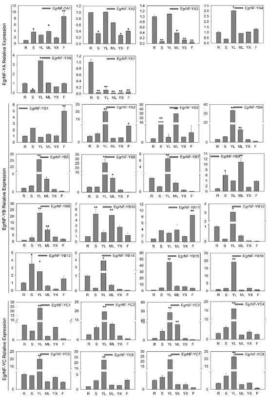 Expression patterns of EgrNF-Y genes in different tissues. R, S, YL, ML, YX, and F are used to denote roots, stems, young leaves, mature leaves, xylem, and flowers, respectively. Data are mean ± SE of three biological replications. The asterisk above the bar indicates the difference in expression (* p < 0.05, ** p < 0.01, root as a control group).