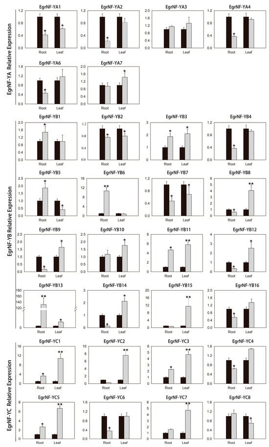 Expression pattern analysis of EgrNF-Y gene in E. grandis seedlings under phosphorus deficiency condition. The black column represents normal growth condition, and the gray column represents phosphorus-deficient growth conditions. The gene expression analysis involved the collection of roots and leaves, respectively. The error bar represents the standard deviation of the three biological replicates. “*” and “**” denote statistically significant differences from the control sample at the 0.05 and 0.01 significance levels (t-test), respectively.