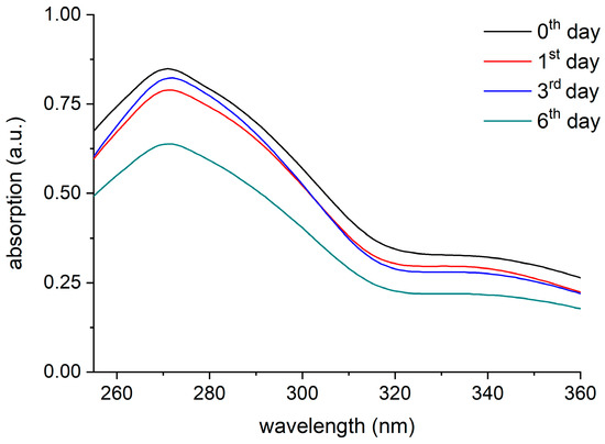 The absorption spectrum of the main bioactive component of the tree of heaven leaf extract incorporated into the chitosan–gelatin polymer matrix for 6 days.