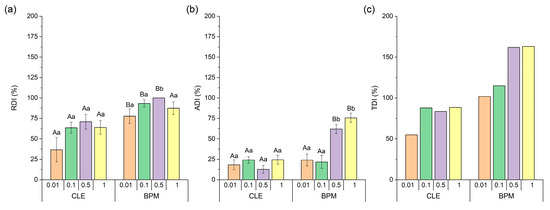 Feeding deterrent activity of the tree of heaven crude (CLE) and leaf extracts incorporated into a biopolymer matrix (BPM): (a) relative deterrence index (RDI) (choice assay); (b) absolute deterrence index (ADI) (non-choice assay); and (c) total deterrence index (TDI). Experimental groups that do not share the same capital letters above bars indicate significant differences between the same concentrations of CLE and BPM. Experimental groups that do not share the same small letters above bars indicate significant differences among the tested concentrations within CLE or BPM.