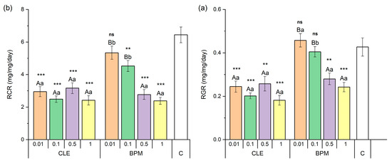 A similar pattern was observed for the RGR values, where significant differences at concentrations of 0.01% and 0.1% were detected after pairwise comparisons, following a one-way PERMANOVA, between the same CLE and BPM concentrations. The highest RGR value for the BPM was recorded at 0.01%, followed by 0.1%, with both concentrations being statistically different from each other and the other tested BPM concentrations. In contrast, no significant differences were observed among the tested CLE concentrations (Figure 3b).