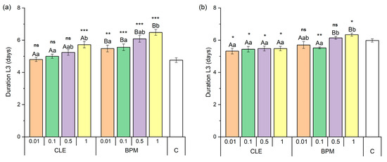 The effect of the tree of heaven crude (CLE) and leaf extracts incorporated into a biopolymer matrix (BPM) on the spongy moth larval performance: (a) Duration of third larval instar in the test for digestive toxicity (DL3D). (b) Duration of third larval instar in the test for contact toxicity (DL3C). *, **, *** indicate significant differences in treatment groups from the control group (p < 0.05, p < 0.01, p < 0.001, respectively), while ns indicates no significant differences in treatment groups from the control group. Experimental groups that do not share the same capital letters above bars indicate significant differences between the same concentrations of CLE and BPM. Experimental groups that do not share the same small letters above bars indicate significant differences among the tested concentrations within CLE or BPM.