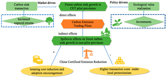 The CET policy promotes the steady growth of carbon sinks through both direct and indirect effects (as shown in Figure 1). The direct effects are most prominent in pilot areas, which serve as experimental platforms for developing carbon market trading mechanisms. These regions establish carbon trading markets that allow enterprises to buy and sell carbon emission rights, thereby creating demand for carbon sinks and recognizing their value as tradable commodities. The economic benefits generated by these markets incentivize participation from both enterprises and individuals, while the policy provides support and subsidies for carbon sink projects, reducing development and operational costs [5], and making carbon sink activities more financially viable [8]. The indirect effects primarily manifest through the demonstration effect, where successful experiences in pilot areas influence carbon sink growth in non-pilot regions. By sharing carbon market data and experiences, pilot areas raise awareness and interest in carbon sink projects among enterprises and individuals in non-pilot regions, lowering learning costs and encouraging the adoption of carbon sink initiatives and practices [14]. However, the indirect effects are relatively smaller than the direct effects due to local protectionism (as regional policies that prioritize local economic interests, often restricting external influences, which can limit the scale and effectiveness of carbon sink projects). Many regions impose strict restrictions on the origin of carbon sink projects, resulting in higher transaction costs for projects from outside areas. This local protectionism limits the scale and liquidity of the carbon market, reducing the potential for non-pilot areas to benefit from carbon sink returns.