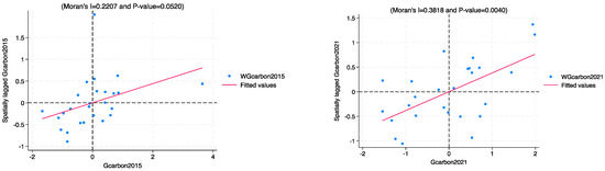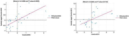 Figure 2 shows the results of the Moran’s index tests. Figure 3 presents the Moran scatter diagrams for the years 2005, 2010, 2015, and 2021. In the context of the Moran’s I statistic for the year 2021 provided in the figure (with a value of 0.3818 and a p-value of 0.0040), the spatially lagged Gcarbon2021 indicates how strongly the carbon sink growth in 2021 in the neighboring regions was correlated. The positive Moran’s I value suggests that there was a clustering of similar values of carbon sink growth in 2021—meaning regions with high or low carbon values tend to be adjacent to regions with similar carbon sink growth values. It can be observed that from 2003 to 2021, there was a significant positive spatial correlation in carbon sink growth. The spatial correlation of carbon sink growth across provinces has clear dynamic characteristics, indicating the influence of diverse factors and potential transregional spillover effects. This study further explores the drivers of carbon sink growth and their indirect impacts between provinces. The comparison highlights regional correlations, particularly among geographically adjacent areas with similar growth trends, although notable differences exist between some neighboring provinces.