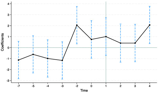 Figure 4 presents the results of the parallel trend test. Building on the methodology described by [36], this study adopted the ‘event study method’ to evaluate the parallel trend assumption. The benchmark period was set to one year prior to the initiation of the CET policy. To capture the effects, interaction terms between the year dummy variables and the corresponding policy dummy variables were created, encompassing a six-year period prior to CET implementation and a four-year period post-implementation. The coefficients related to the CET policy implementation were not statistically significant, indicating no notable differences between the treatment group consisting of provinces where the CET policy had been implemented and the control group including provinces without CET policy implementation prior to the policy’s introduction, thus satisfying the parallel trend assumption. However, from the fourth year following the CET policy implementation, the confidence intervals for its impact on forest carbon sink growth excluded 0. This finding suggests that despite an initial time lag, the CET policy has a significant long-term effect on forest carbon sink growth.
