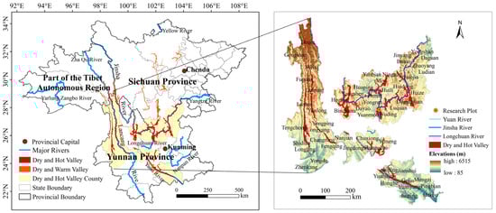 Location, elevation, and relative position of the research plot within the dry and hot valleys in southwest China.