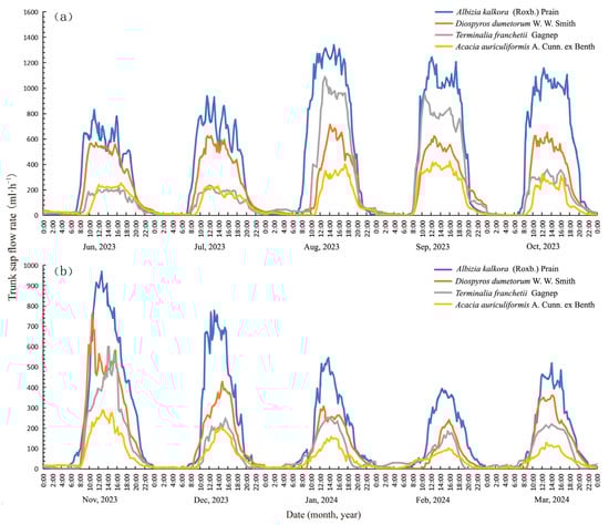 Daily dynamics of trunk sap flow rates for the four study species: (a) wet season and (b) dry season.