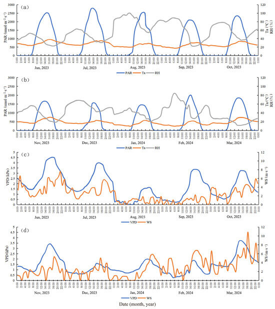 Daily dynamics of environmental factors including (a) PAR (photosynthetically active radiation), Ta (atmospheric temperature), and RH (relative humidity) during the wet season. (b) PAR, Ta, and RH during the dry season. (c) VPD (saturated water vapor pressure difference) and WS (wind speed) during the wet season, and (d) VPD and WS during the dry season.