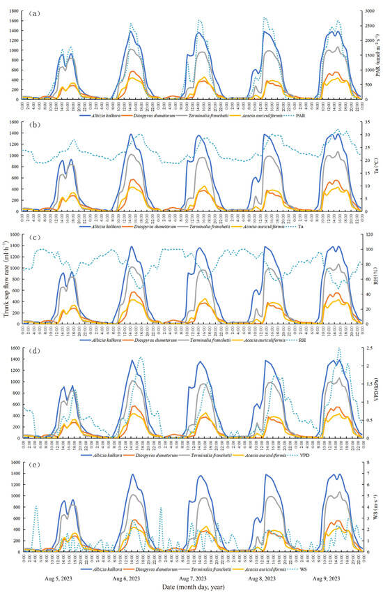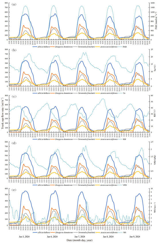 The rate of trunk sap flow is influenced by the physiological condition of plants and environmental factors such as PAR, Ta, RH, VPD, and WS [51,52,53]. Interactions between meteorological factors and plant physiological conditions also play a role, with the primary factors affecting changes in sap flow varying by region. To visualize the changes in sap flow and meteorological factors for the four typical tree species, sap flow data from five days (5–9 August 2023 during the wet season, and 5–9 January 2024 during the dry season) were selected for synergistic analysis. These data were plotted alongside synchronized meteorological data for the monitoring periods of dry and wet seasons (Figure 4 and Figure 5), respectively. In the wet and dry seasons, the maximum PAR was 2766 and 1472 μmol·m−2·s−1, maximum Ta was 32.0 °C and 22.9 °C, minimum Ta was 18.8 °C and 8.8 °C, maximum RH was 99.9% and 54.5%, minimum RH was 47.3% and 15.4%, maximum VPD was 2.511 and 2.218 kPa, minimum VPD was 0.002 and 0.538 kPa, and maximum WS was 4.06 and 6.87 m·s−1, respectively. In the dry season, the peak sap flow rate of the typical tree species was approximately 3 h earlier than the corresponding maxima of Ta and VPD.