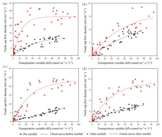 Relationship between trunk sap density and transpiration variables before and after rainfall for: (a) Albizia kalkora, (b) Diospyros dumetorum, (c) Terminalia franchetii, and (d) Acacia auriculiformis.