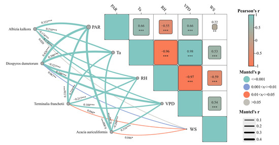 Monitoring sap flow density and environmental factors of the four tree species during the study period showed that the sap flow rates were significantly higher after rainfall than before. Each tree species exhibited a positive exponential relationship between sap flow density and transpiration variables before and after rainfall (Figure 6 and Table 3). The fitting parameters (a and b) of sap flow density to transpiration variables differed significantly before and after rainfall (Table 3). Parameters a and b increased significantly for Acacia auriculiformis and Albizia kalkora after rainfall, suggesting that the sensitivity of their sap flow density to the environment and their hydraulic conductivity increased after rainfall. For Diospyros dumetorum and Terminalia franchetii, the sensitivity of sap flow density to the environment decreased slightly, while their hydraulic conductivity showed an increasing trend. Compared to Diospyros dumetorum and Terminalia franchetii, the sap flow density of Acacia auriculiformis and Albizia kalkora was more strongly affected by rainfall. Comparing the increase in the fitted parameter b, the hydraulic conductivity of the tree hydraulic system was ranked as follows: Terminalia franchetii > Albizia kalkora > Acacia auriculiformis > Diospyros dumetorum. When water is effectively replenished after drought, plants with strong bolting and refilling abilities are more suited for survival [54]. The comprehensive results of the study showed that Acacia auriculiformis and Albizia kalkora are rainfall-sensitive plants, while Diospyros dumetorum and Terminalia franchetii are rainfall-insensitive. The water conductivity of deciduous tree species was greater than that of evergreen tree species, and tree species with longer deciduous periods had stronger water conductivity [55]. We analyzed the correlation heatmap of the Pearson correlation coefficient and Mantel test results (Figure 7) and found that the trunk sap flow of different tree species, which is significantly correlated with various environmental factors. The trunk sap flow rates of all four species showed highly significant positive correlations with PAR, Ta, and VPD (p ≤ 0.001) and highly significant negative correlations with RH (p ≤ 0.001). Albizia kalkora exhibited non-significant correlations with WS (p > 0.05), while Diospyros dumetorum showed significant correlations with WS (0.001 < p ≤ 0.01). Terminalia franchetii and Acacia auriculiformis showed lower significance with RH (0.01 < p ≤ 0.05). The r values of the Mantel test indicated that the strongest correlations of trunk sap flow were with PAR for all four species, followed by Ta, with the smallest correlations observed with WS. Overall, the hierarchy of correlations between environmental factors and trunk sap flow rates was PAR > Ta > VPD > RH > WS. Within a single day, RH showed highly significant negative correlations with Ta and VPD (r = −0.96, r = −0.97), consistent with the formula for calculating VPD. Ta exhibited a highly significant positive correlation with VPD (r = 0.98), indicating a significant increase in VPD with rising Ta.