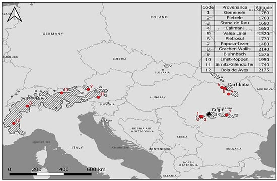 Twelve European provenances of Swiss stone pine were tested, with seven originating from the Romanian Carpathians, and five originating from the Alps (Austria, Switzerland, and France), an experiment that is singular in Europe. These provenances cover a substantial portion of the species’ natural distribution, with a north latitude range of 4°36′ (from 45°12′ to 49°48′) and a larger east longitude range of 20°29′ (from 4°48′ to 25°17′); the altitudinal amplitude was also considerable, being of 695 m (Figure 1). The seedlings were obtained from ten to twenty-plus trees, situated at a minimum of 50 m from each other, to avoid inbreeding and ensure a high level of genetic diversity [44,45].