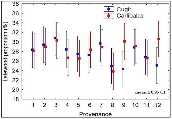 Latewood proportion of the provenances in the Cugir and Cârlibaba trials (mean ± 0.95 CI).
