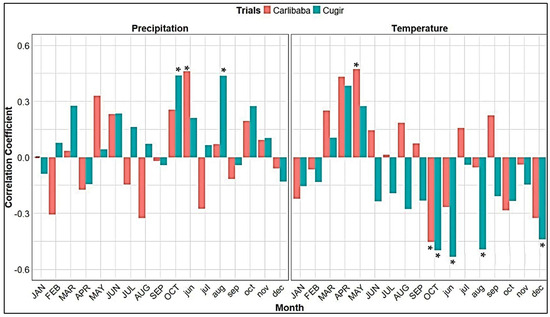 To analyze the climate effects, the RWIs of all provenances at both sites were correlated with monthly temperature and precipitation. For each wood trait, data from the previous (June–December) and current year (January–October) were correlated with the current-year RWIs. The correlations were performed with the treeclim package [57] in the R program [54].