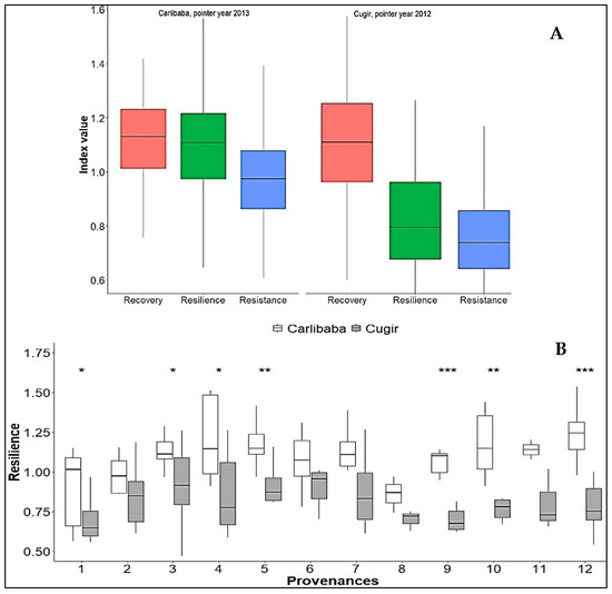Box plot showing the min, median, and max values and the quartiles for the recovery, resistance, and resilience indices of the ring-width series at the trial level (A) and the resilience of the twelve provenances at the two testing sites (B). Significant differences (*, **, ***) at p < 0.05, p < 0.01, and p < 0.001.