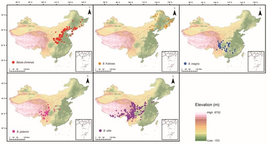 The southwestern region of China is characterized by a subtropical monsoon climate [42], with red and brown soils as the dominant soil types in the region. The vegetation distribution is complex, exhibiting a clear vertical stratification [43]. In contrast, the northeastern region spans cold, middle, and warm temperate zones, where biodiversity in transitional areas is relatively low and highly susceptible to climate change [44]. Approximately 31 species of Betula are found in China, primarily distributed across the northeastern, northwestern, and southwestern mountainous regions [34]. However, some species lack sufficient distribution data, making it difficult to construct accurate models [45]. In this study, we selected five representative species based on their distribution areas and collected their distribution data from the Global Biodiversity Information Facility (GBIF, https://www.gbif.org/; accessed 26 December 2024). Spatial autocorrelation was minimized using a thinning approach with the R package “spThin” v.0.1.0, applying a 5 km × 5 km grid resolution to ensure only one occurrence record per grid [46]. After spatial thinning, the following occurrence points were used for modeling: 120 for B. chinensis, 40 for B. fruticosa, 55 for B. insignis, 41 for B. potaninii, and 216 for B. utilis (Table 1 and Figure 1). ArcGIS 10.8 (Esri, Redlands, CA, USA) was used to generate maps of species occurrences (Figure 1).